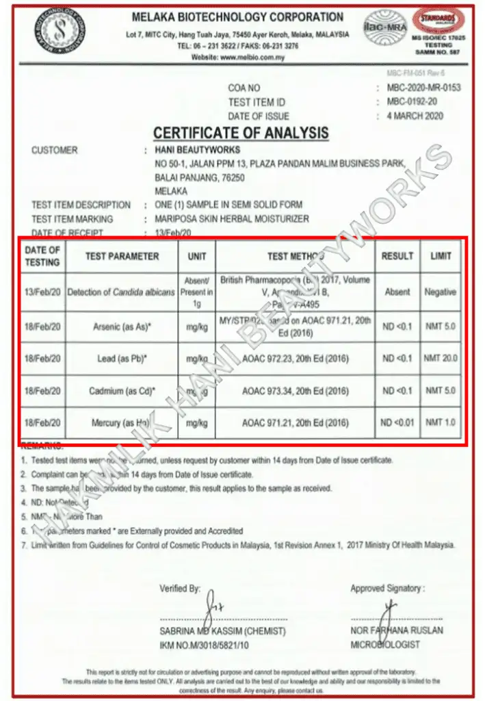 Sijil Ujian Makmal - Tiada bahan kimia berbahaya
