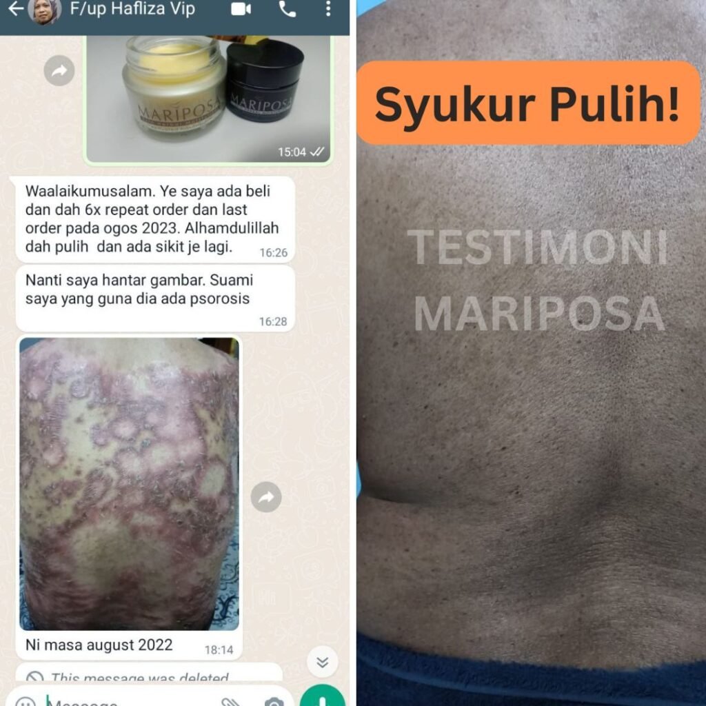 Pn Hafliza – suami pn Hafliza mengalami psoriasis yang teruk sehingga belakang badannya banyak tompok2 merah. Alhamdullilah setelah menggunakan mariposa dengan konsisten, kulitnya telah pulih dengan cantik.